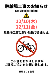 駐輪場工事に伴い、自転車を駐輪することができません。