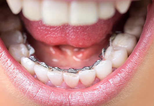矯正中に矯正装置を使う場合は、歯の裏側の矯正装置部分に食べかすが付きやすくなります。